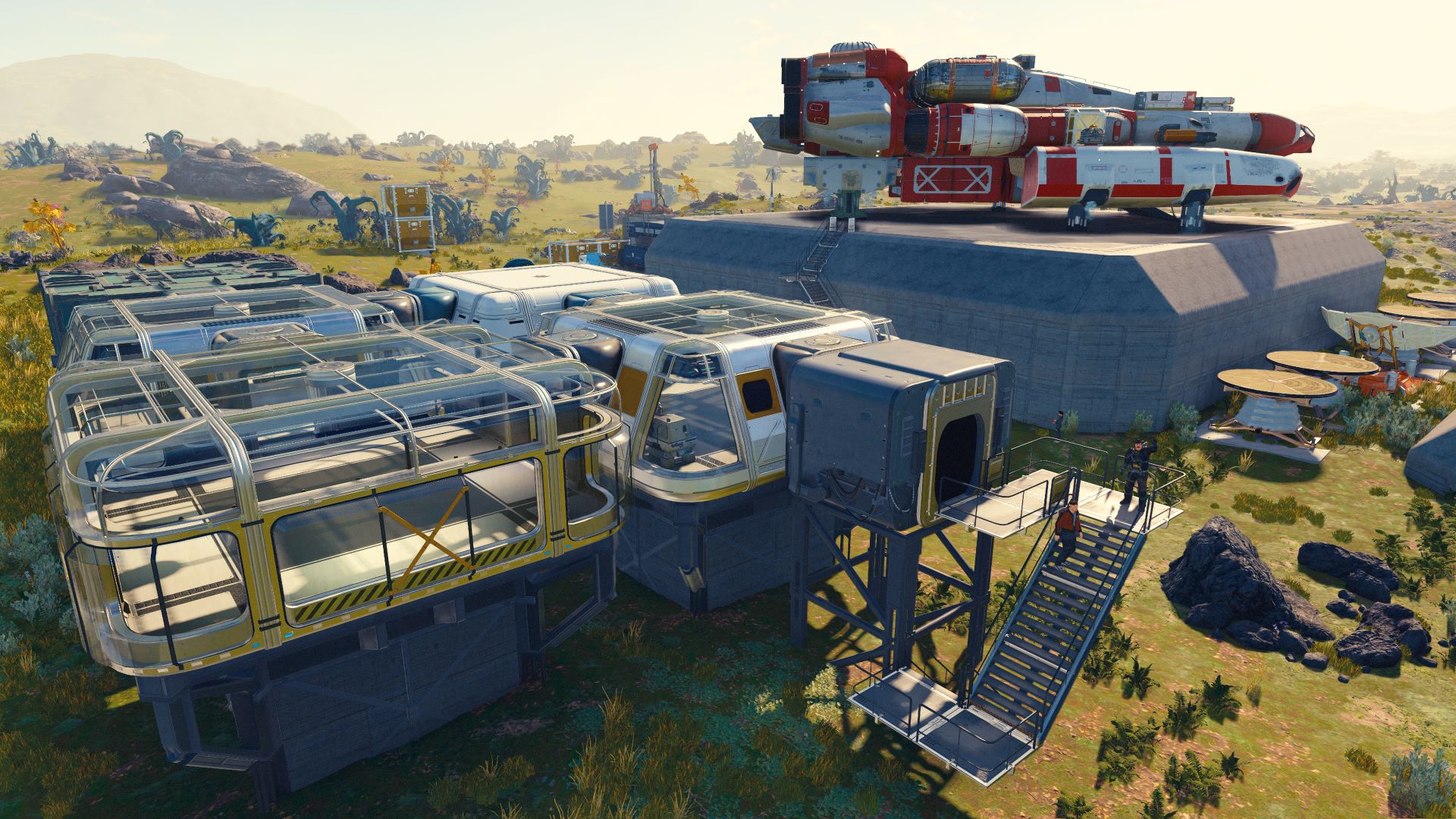 Apropos Außenposten: Wenn Dir ein Planet besonders gut gefällt, kannst Du ihn über Dein Scanner-HUD zu einer Basis ausbauen. Diese Basen können eine Menge Ressourcen kosten, ermöglichen es Dir aber, bewohnbare Gebäude, Ressourcenextraktoren und sogar Crew-Management-Stationen zu errichten. Diese erlauben es Dir, Angestellte, die Du angeheuert hast, auf Deinem Außenposten arbeiten zu lassen. Mit der Zeit kannst Du sogar Frachtverbindungen bauen, um Ressourcen von anderen Außenposten zu importieren und Deinen Betrieb vollständig zu automatisieren.