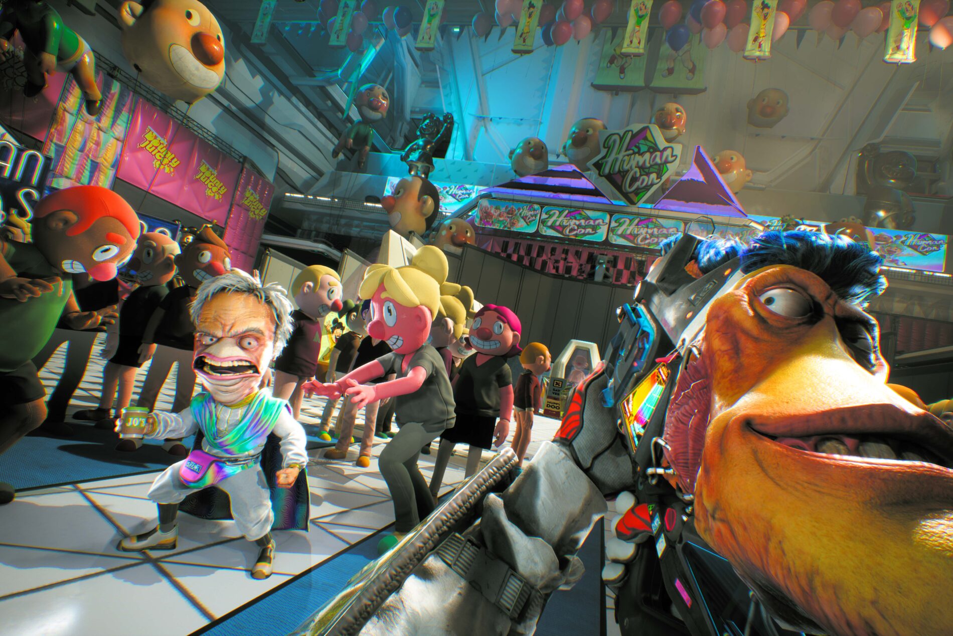 Die Hands-on-Vorschau knüpft an das Ende von High On Life an und beginnt damit, dass ich mit einem Fallschirm in die Welt von ConCon (Convention Convention) springe – einem Planeten voller schwebender Plattformen, auf denen (ihr habt es erraten) Conventions stattfinden. Eine Belohnung hat uns hierhergeführt, denn wir sind auf der Suche nach Senator Muppy Doo, einem Politiker, der mit den bösen Führungskräften von Rhea Pharmaceuticals unter einer Decke steckt. Und diese wollen die Menschheit in… verschreibungspflichtige Pillen verwandeln.