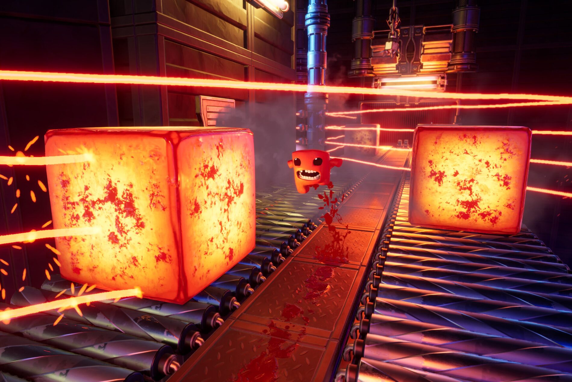 Super Meat Boy 3D sieht darüber hinaus auch großartig aus. Die Umgebung – von traumhaften grünen Plattformen bis hin zu rauen Industriehöhlen – wirkt vertraut, versehen mit einem stilvollen, modernen Flair. Dieser neue Grafikstil bietet Raum für lustige neue Animationen, die die Charaktere und Umgebungen wirklich zum Leben erwecken. Eichhörnchen, die mit Waffen herumlaufen, Lava, die von den Wänden tropft, und natürlich viele weitere blutige Gefahren, die Meat Boy ein schnelles Ende bescheren können.