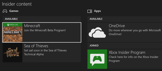 Insider content displays all playtests and previews you’re eligible to participate in. At minimum you’ll always find Xbox Insider Program (which you’re automatically enrolled in) and Xbox One Update Preview (where you can register to preview system updates) in Insider content.