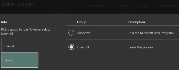 If for any reason you’d like to unenroll from a playtest or preview, return to the details page and select Manage (which replaces the Join button). From the available options, select Unenroll, then select Done.