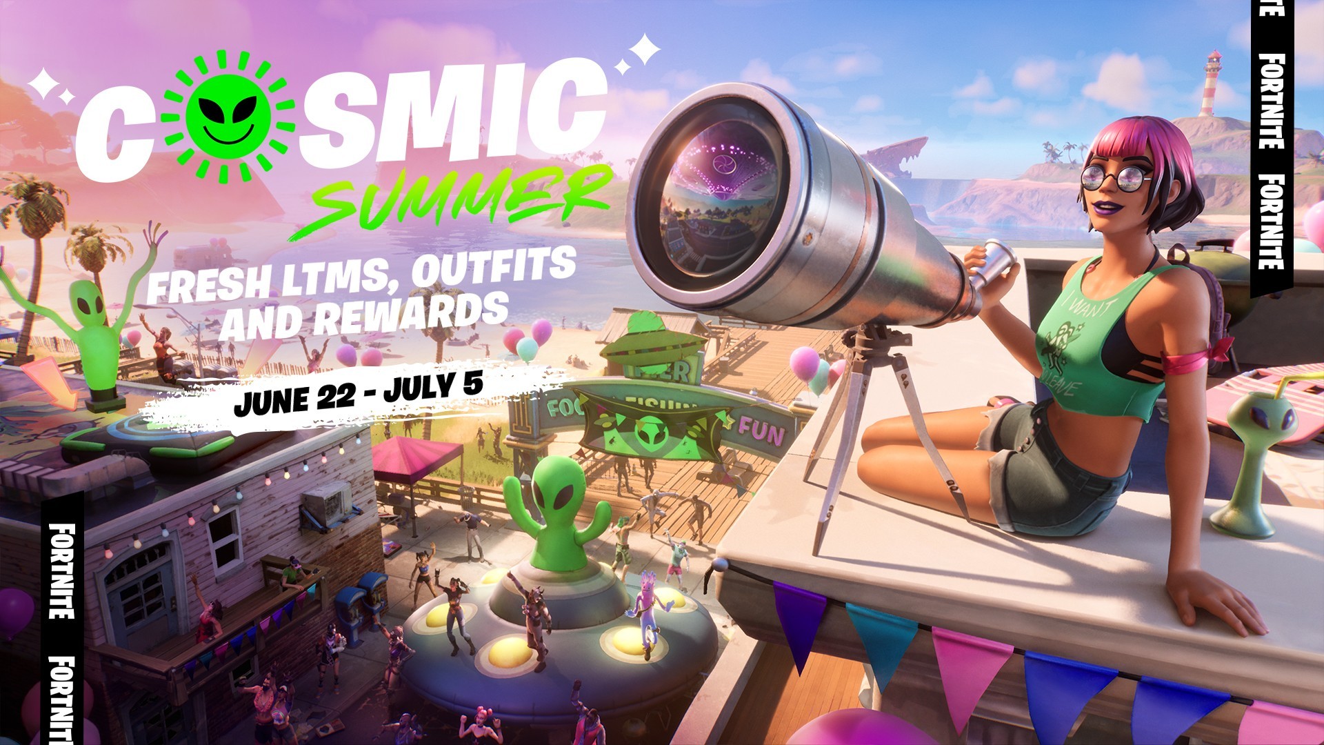 There may be a giant mothership in the sky, but don’t let that stop you from having fun in the sun. The Fortnite Cosmic Summer event starts now!