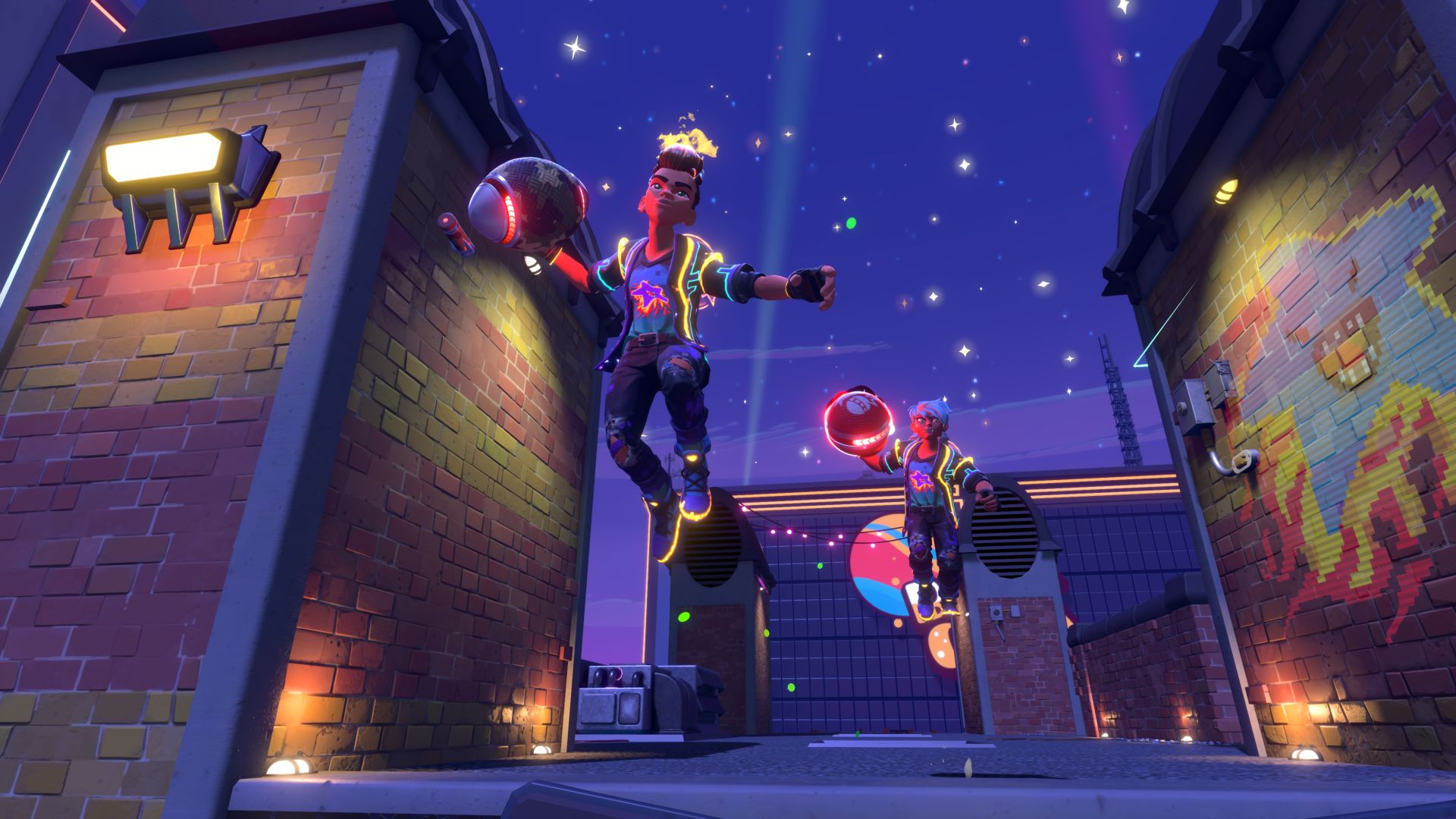 Invite your friends over, and play some hoops! Basketball hoops are now positioned throughout, which will give you a celebratory explosion when you land a slam dunk. Then, head on over to the brand new rooftop space, complete with a soccer field, where you and your buddies can skirmish in between brawls. First team to three goals wins!