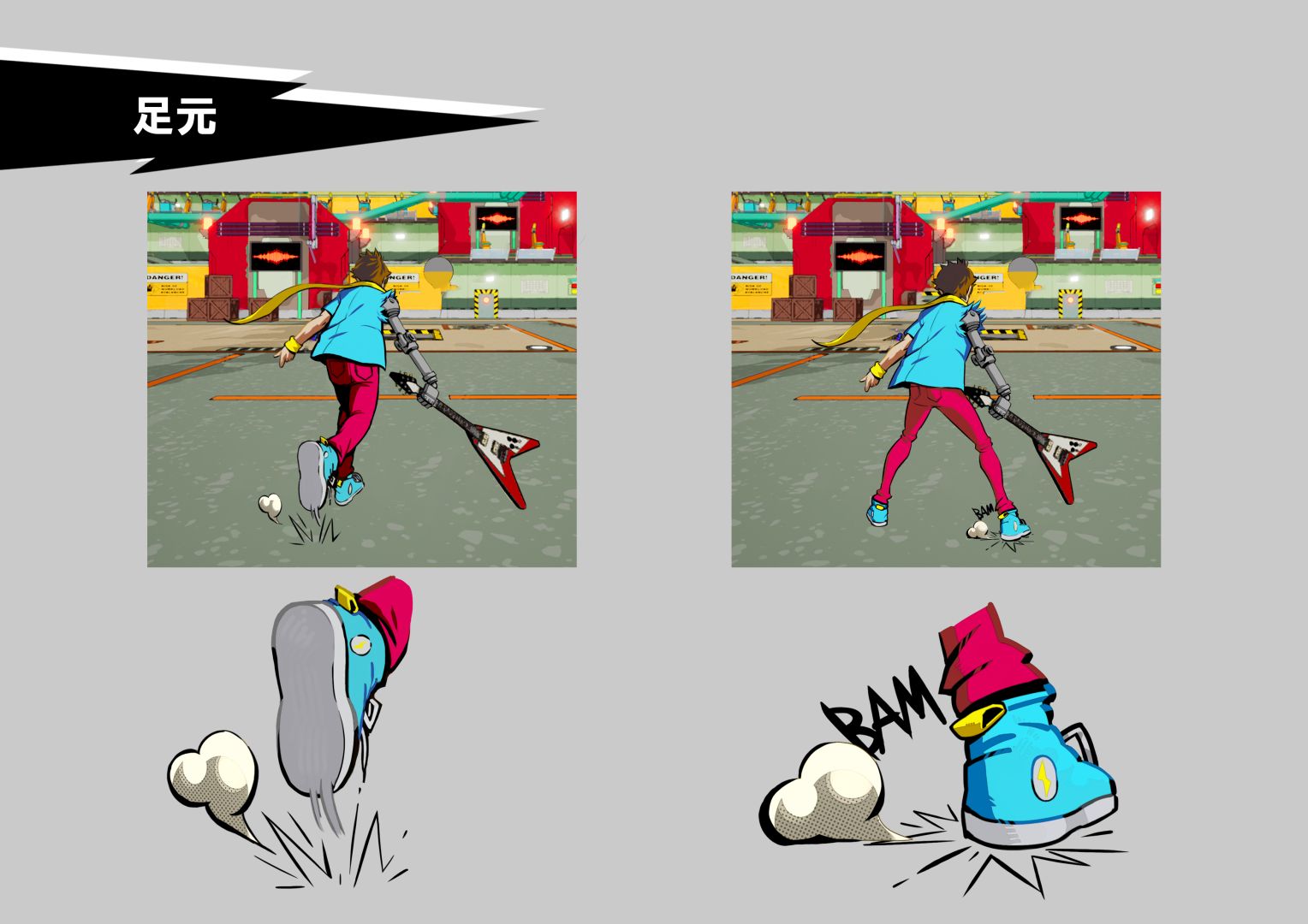 We found by trial and error the BPM range that we’re like, “OK, gameplay in this range is fun and enjoyable.” I think it was about, 130 to about 160 BPM, and there is a significant difference if you play them back-to-back, but we can use that as sort of a way to gauge difficulty and feeling for different stages just by pure battle design. We would do it with a click track, and then we would come in and we’d make a stage and part of the stage prompts would be like, “This stage is going to feature this type of rock music,” and I would give a bunch of samples about the vibe that we’re going for. “And then for this stage we wanted difficulty increase, so we’re going to up the BPM to like 145 here.” So that’s how we scaled everything. But everything that we made was interpolated, so we didn’t have to redo animations. It was actually very easy to say like, “OK, let’s just do 145… click track… and then we’ll try it out to that.”