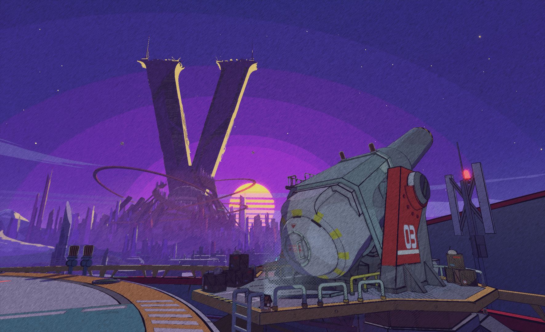 We had this 2D image, which is literally in the first part of the game. It’s where you first see the big Vandelay Tower, the V Tower, and in the distance you’re in this sort of production area. And everything had these keywords, this sort of colorful, sharp, and clean look. And especially when that first 2D image came out, we would put that up and say, “We should make the game look like this image.”