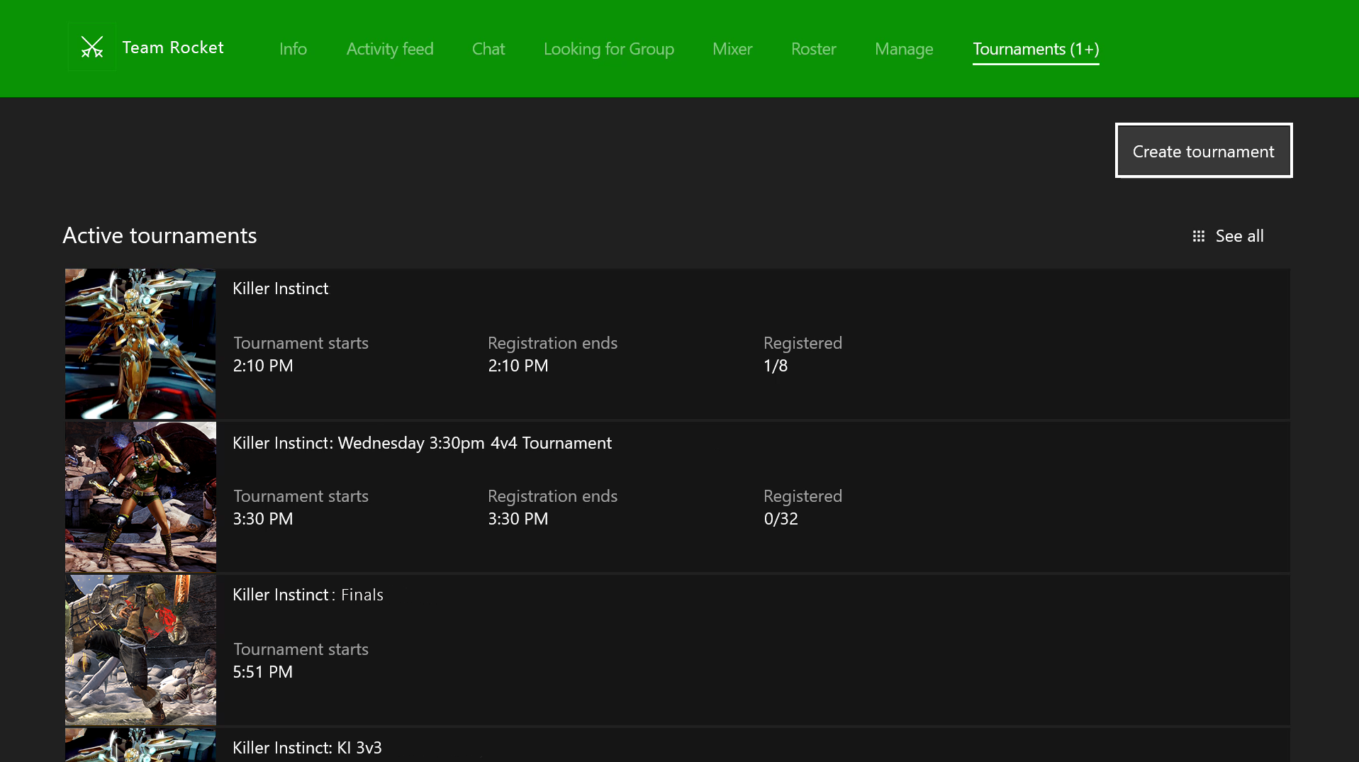 Grâce aux tournois créés par les utilisateurs pour Killer Instinct sur Xbox One, il est plus facile que jamais d’affronter ses amis. Pour cela, il convient d’accéder au Club concerné et de sélectionner l’onglet Tournois, puis de choisir « Créer un tournoi » et le jeu. La suite est identique à l’application Xbox avec les réglages du nom, des règles, de l’heure de début et de la description. Il est ainsi possible de créer un tournoi Arena directement depuis la console.