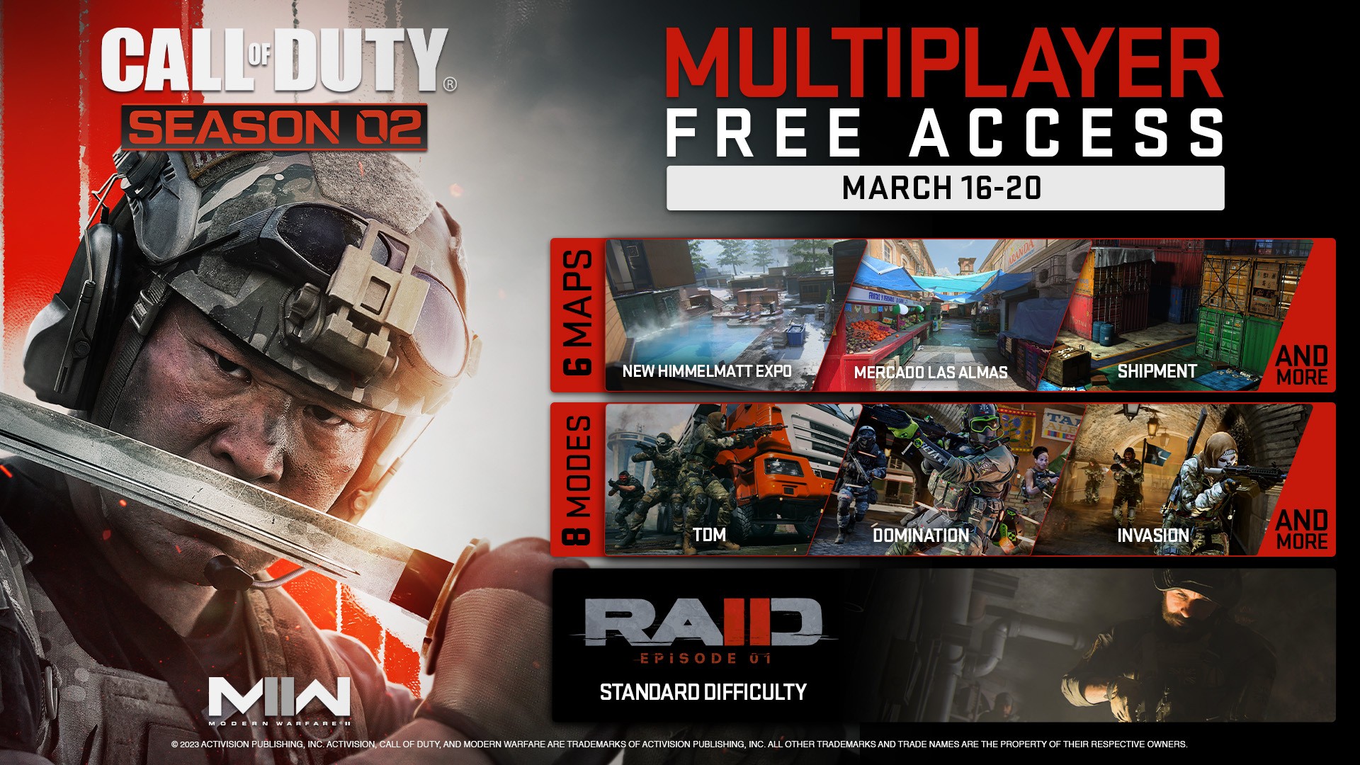 Autre bonne nouvelle : vous pouvez désormais essayer gratuitement le mode multijoueur de Modern Warfare II sur Xbox One et Xbox Series X|S, et ce jusqu'au 20 mars 2023. Vous pourrez découvrir une sélection de modes de jeu multijoueur et Opérations Spéciales pendant cette période d'accès gratuit. Attendez-vous à profiter de nombreux modes de jeu différents, comme le Match à Mort en Équipe ou la Domination, mais aussi des modes spéciaux, disponibles depuis le début de la Saison 2 et celui de la Saison 2 Rechargée.