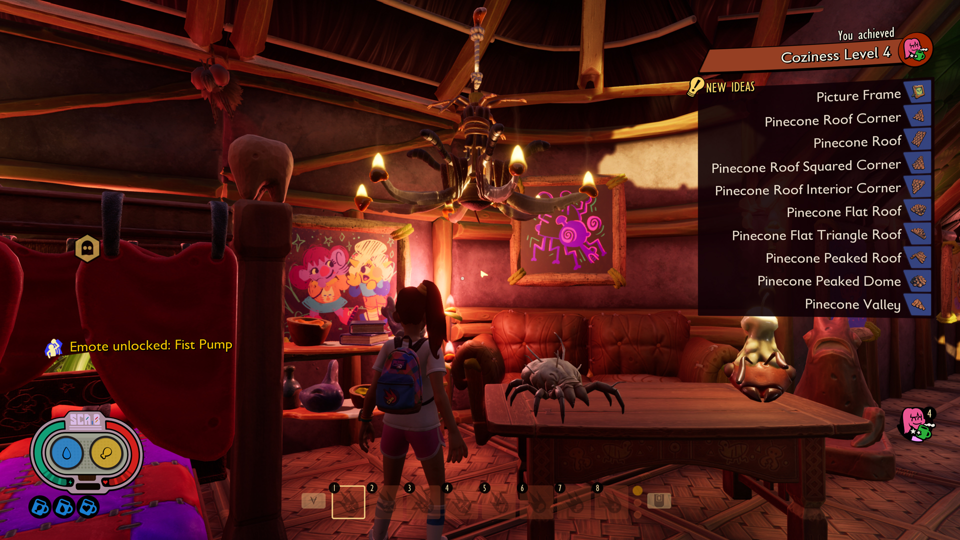 Si vous avez passé du temps à améliorer vos bases pour vous créer un véritable nouveau foyer dans le jardin, vous serez ravi·e d'apprendre qu'un système de niveau de confort de la base a été ajouté. Les bâtiments, les meubles et les décorations feront monter ce niveau et en progressant vous pourrez débloquer des recettes de construction spéciales, une mutation bénéfique pour la construction et même de nouvelles attitudes, exclusives à ce système.