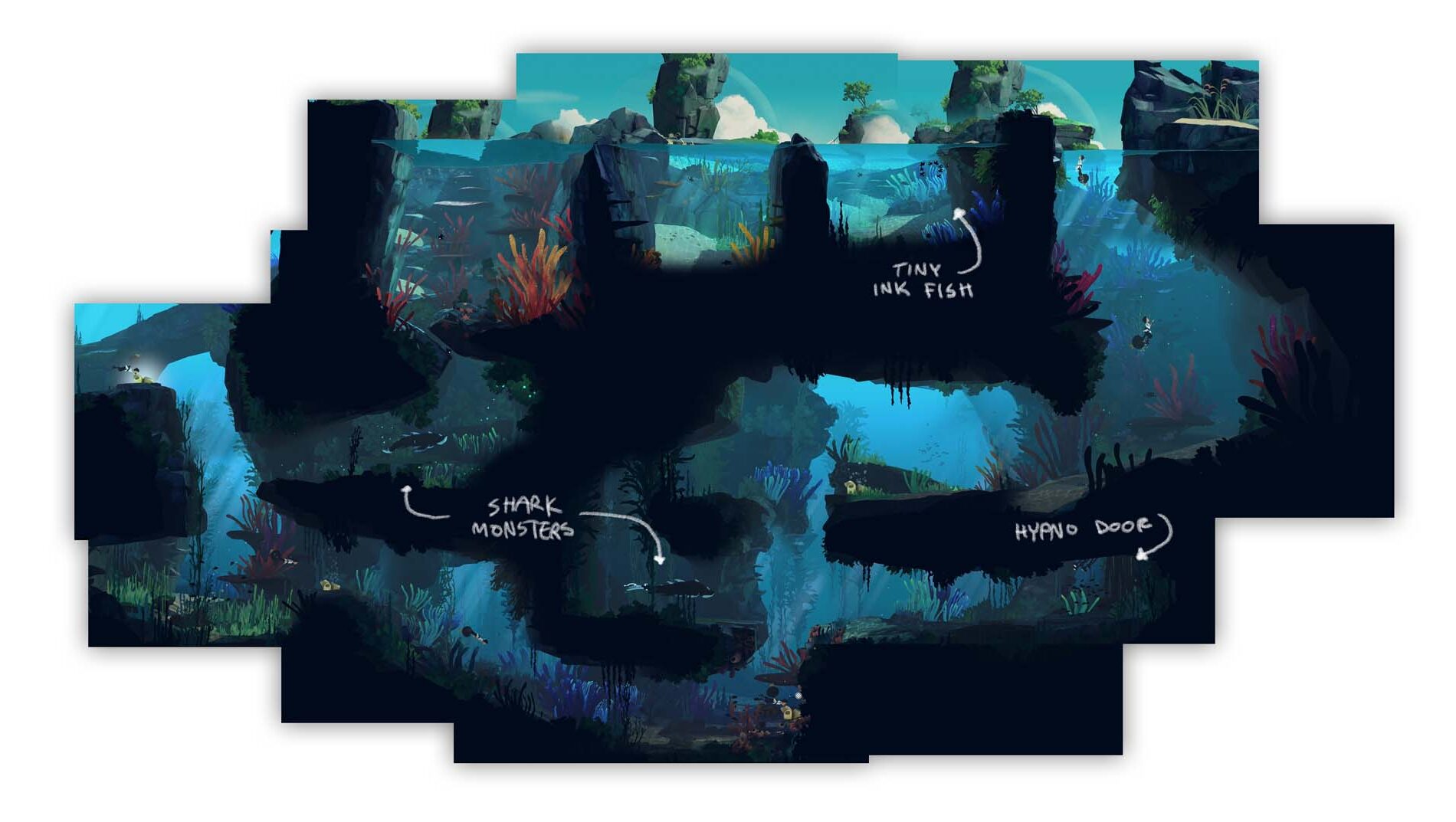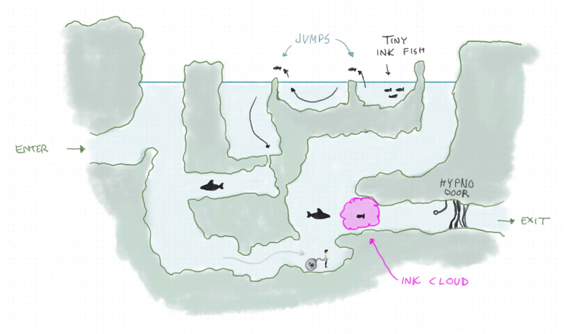 Vous pouvez voir ici un croquis d’une énigme dans laquelle Lana découvre l’une des plantes à bulles mentionnées plus tôt et doit trouver un moyen d’ouvrir la porte d’hypnose sous-marine avec Mui, sans se faire repérer par les créatures marines semblables à des requins.