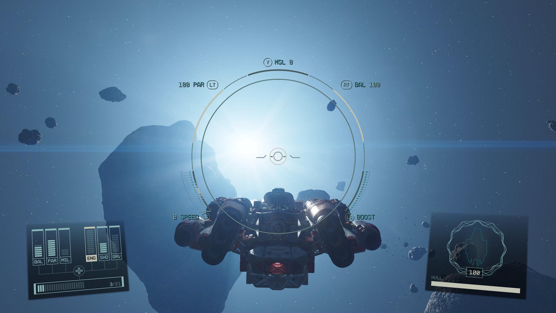 宇宙船の各パーツにおいて鍵となるのは、特徴的なシステムでもある動力源です。動力システムはエンジン、3 つの武器グループ、シールド、グラヴ・ドライブに分かれています。船のリアクターによって、各システムにどれだけのパワーを投入しなければならないかが決まりますが、ゲーム序盤の船では、すべてのシステムをフル稼働させるのに十分なパワーがあることはまずありません。