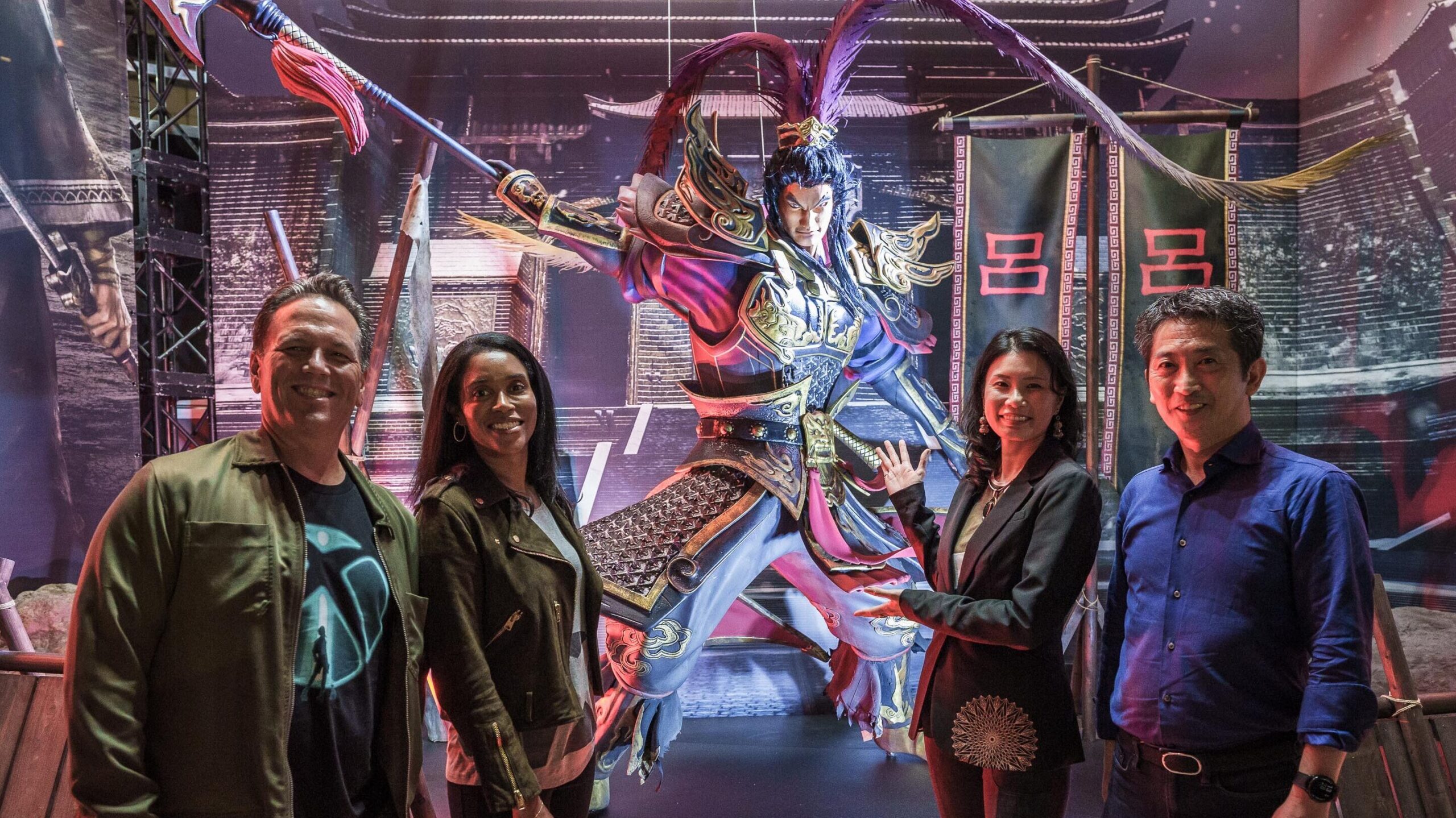 今年の東京ゲームショウに到着した両名が、最初に足を運んだのはコーエーテクモ ブース。その一角を占めていたのは、『真・三國無双 ORIGINS』 (Xbox Series X|S 向けに 2025 年 1 月 17 日発売) に登場する姿で立体化された呂布でした。その雄々しい姿に目を奪われていると、株式会社コーエーテクモゲームスの襟川芽衣取締役常務執行役員、そして同社の IP 事業部長を務める小林英聖常務執行役員が登場。終始和やかな雰囲気の中で四名の話し合いは進み、別れ際には全員で呂布立像の前でポーズを決めました。