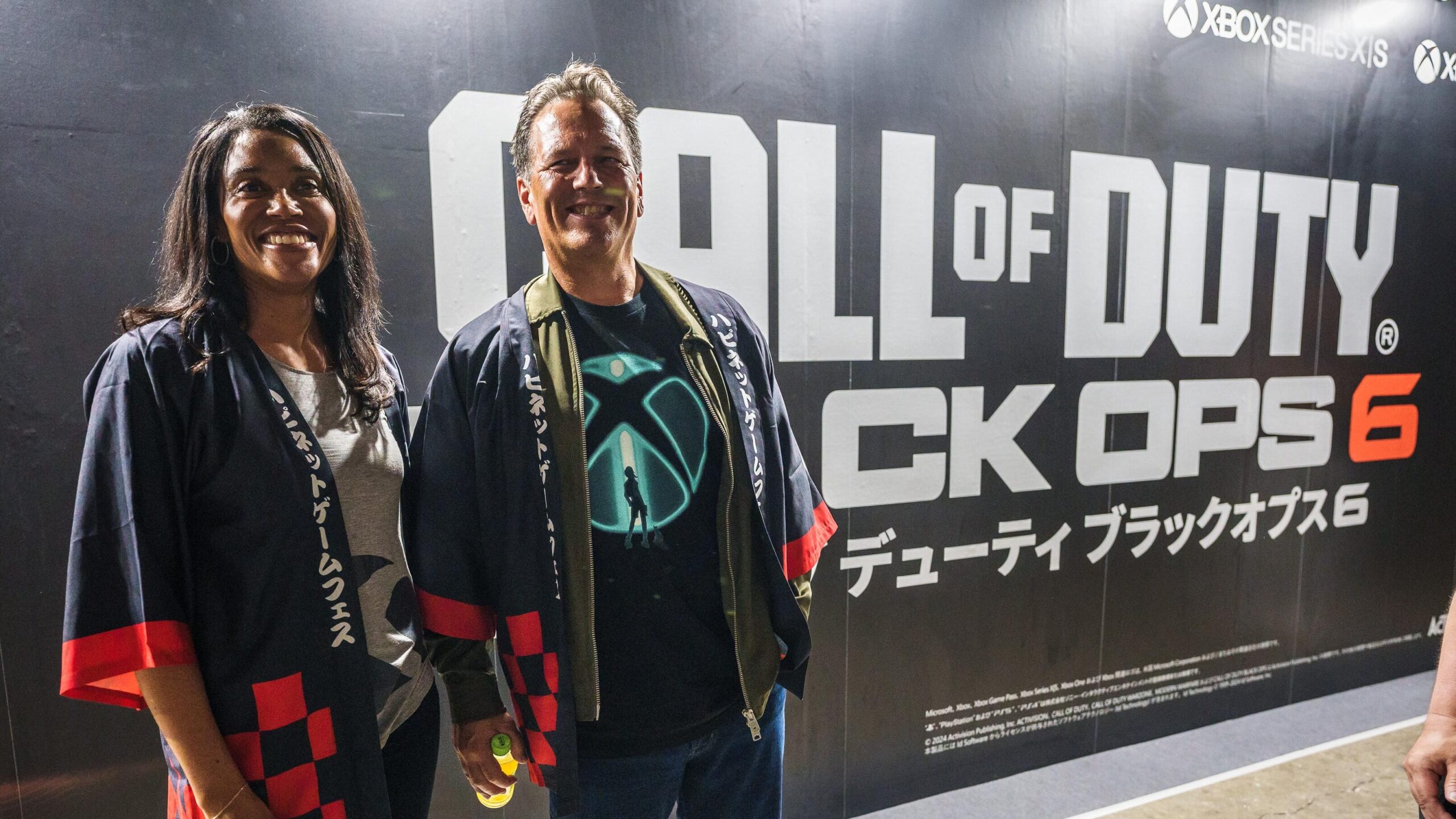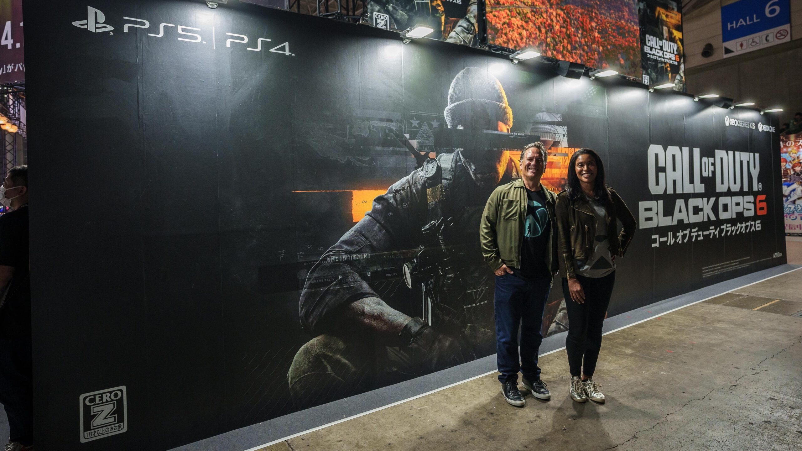 続いて二人が向かったのは『Call of Duty: Black Ops 6』 (Xbox Series X|S、Windows PC、Xbox One 向けに 10 月 25 日発売) のマルチプレイ試遊ができたハピネット ブース。まず真っ先に目に入った大型の『BO6』広告の前で、二人は楽しそうにポーズを取ってくれました。