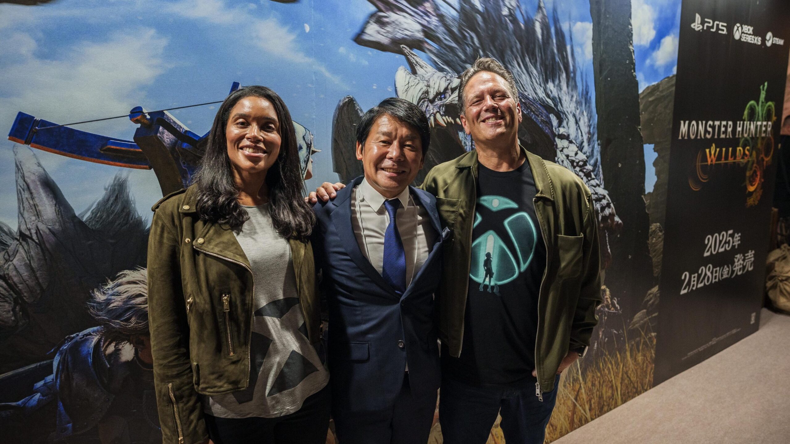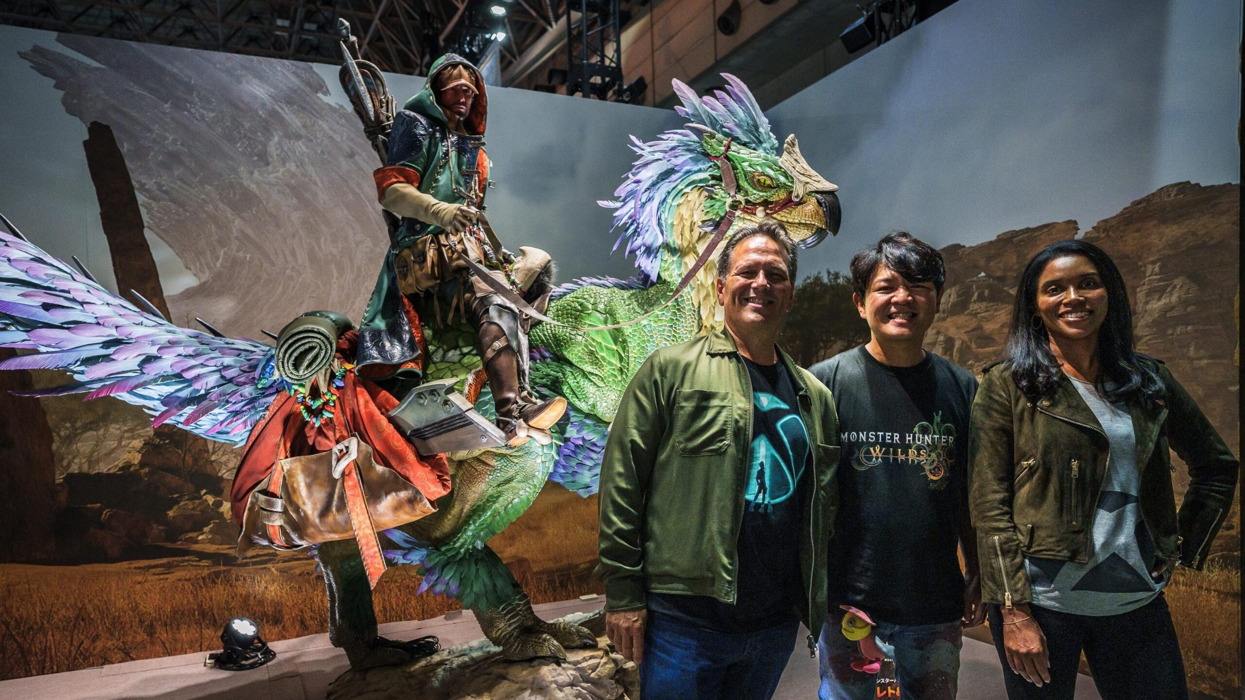 三人はカプコン ブースの一角を占める『モンスターハンターワイルズ』 (Xbox Series X|S 向けに 2025 年 2 月 28 日発売) に登場する「ハンター」とその乗用動物である「セクレト」を立体化した模型の前で記念写真タイムを楽しみました。