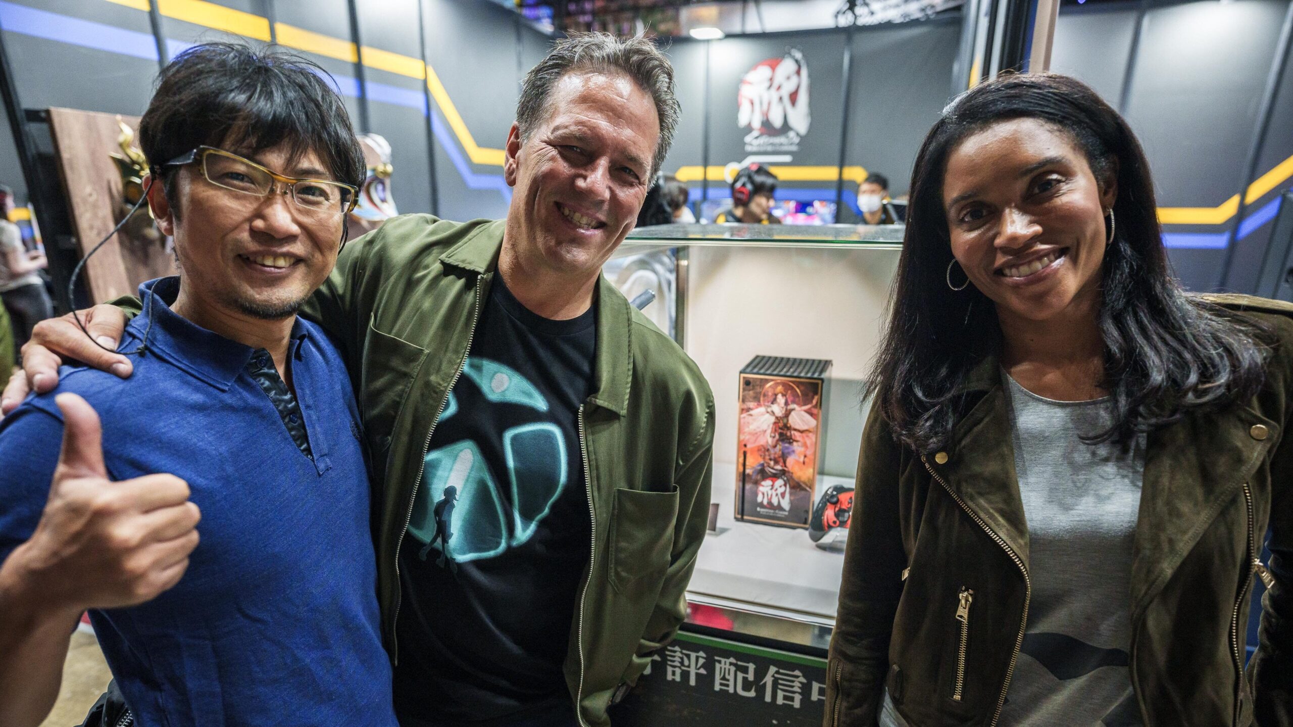 カプコン ブース内に『祇(くにつがみ):Path of the Goddess』仕様の Xbox Series X があると聞きつけた二人は続いて『祇』エリアに移動。同作のプロデューサーを務める平林良章氏に迎え入れられ、特別仕様のコンソールを囲んで記念写真を撮りました。