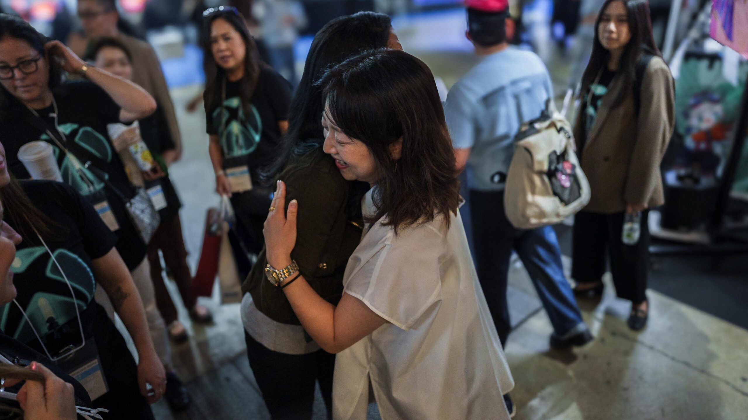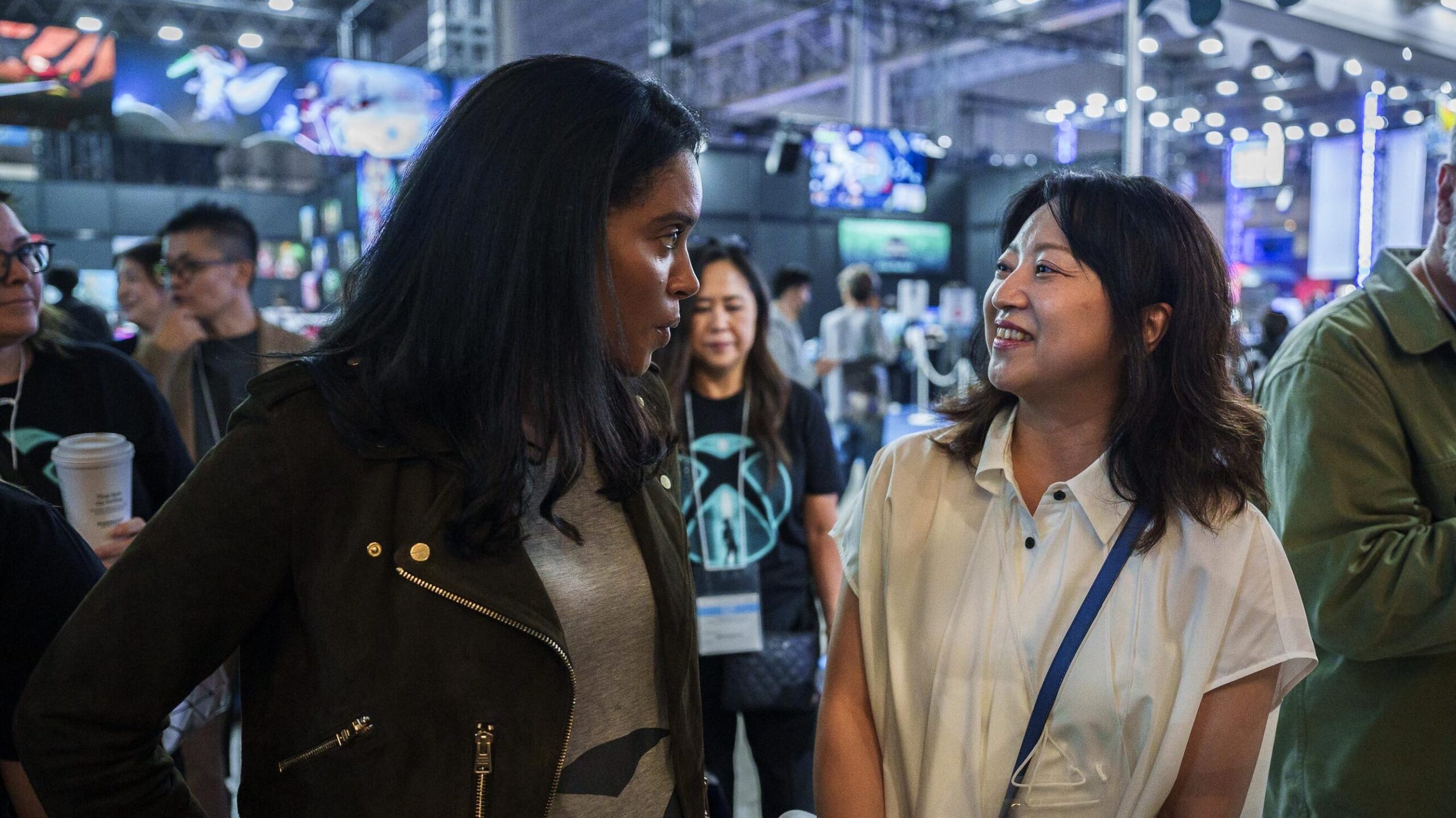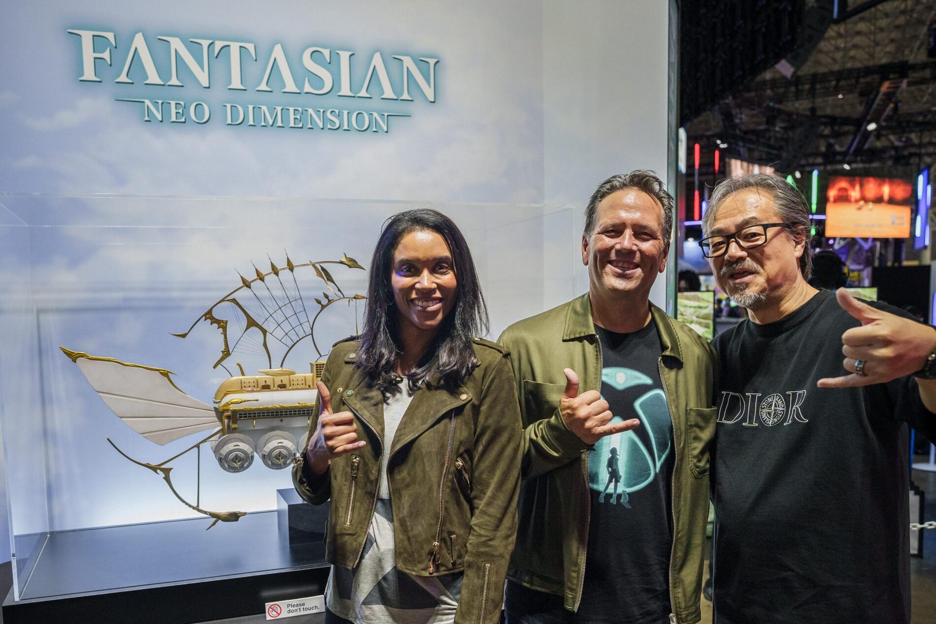 一行が到着すると、ブースで出迎えてくれたのは伝説的なクリエイターであり、「ファイナルファンタジー」生みの親、そしてミストウォーカーの CEO を務める坂口博信氏。同氏が X (旧Twitter) で同窓会会場、と呼ぶほど和んだ空気の中、笑顔にあふれた時間を三人は過ごしました。