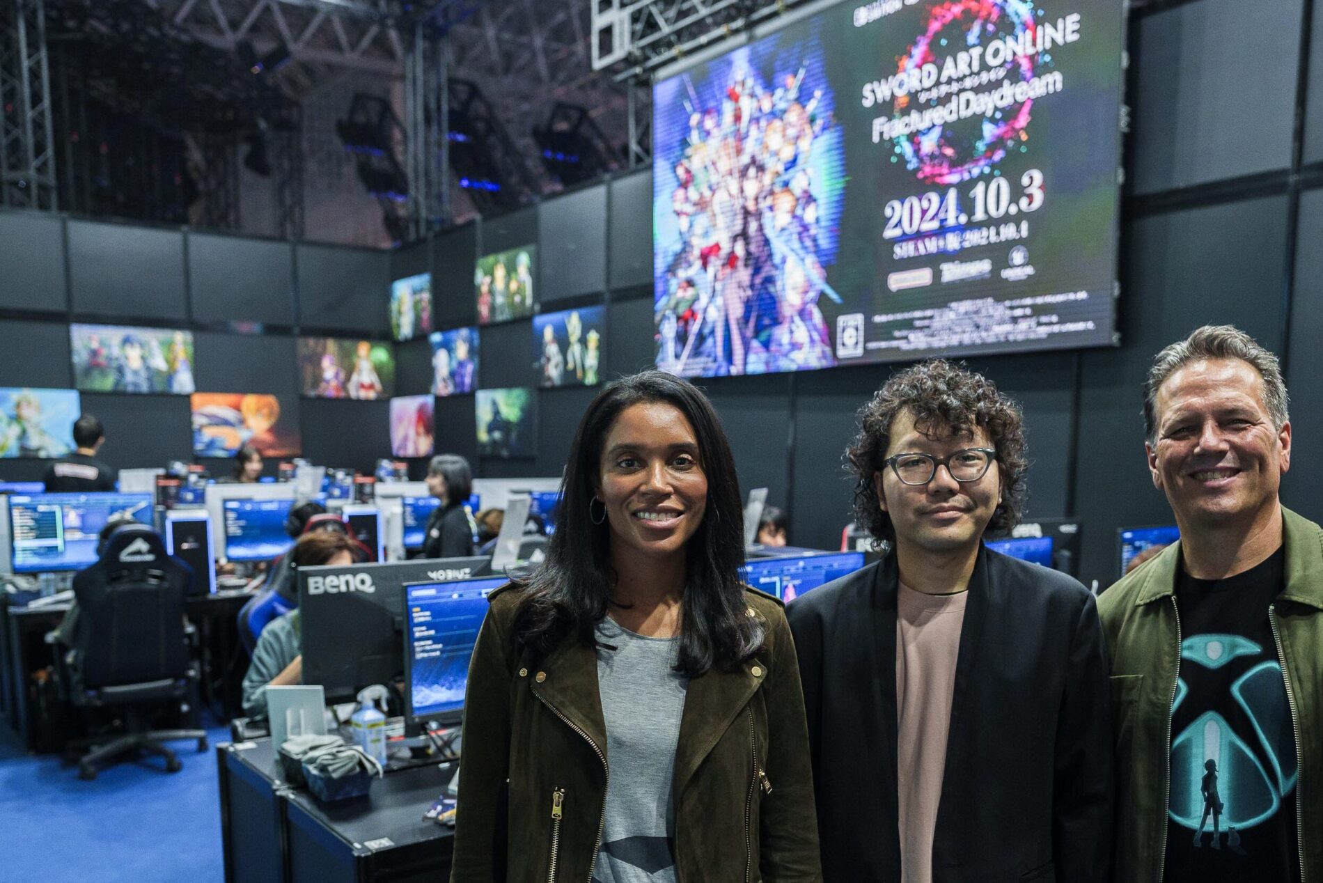 最後のお楽しみに取っていたのは、『ソードアート・オンライン フラクチュアード デイドリーム』 (Xbox Series X|S 向けに 10 月 3 日発売、Steam 向けに 10 月 4 日発売。以下『SAOFD』) コーナーを設けたバンダイナムコエンターテインメント ブースでした。同作のプロデューサーを務める最上頌平氏に迎えられた二人は、大勢の来場者が『SAOFD』を楽しむ空間でしばらく談笑を楽しみました。