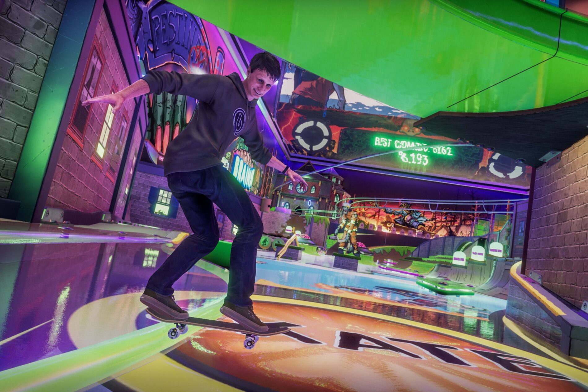 例えば、私のお気に入りのひとつは College のチケットセンター裏にあります。長く曲がりくねった通路に2本の平行なレールがあり、両サイドに 1 つずつあるハーフパイプにつながっています。ここでグラインドを繋げてレールクロスを混ぜると、スコアの倍率が上昇します。さらなる高みを目指すなら、ハーフパイプでトリックを決めることでさらに大きなスコアを獲得できます。各レベルには、カーブのあるプールや遊び心のあるバーティカルランプなど、楽しい発見が必ずあります。自分が遊びやすいポケットをぜひ見つけてください。