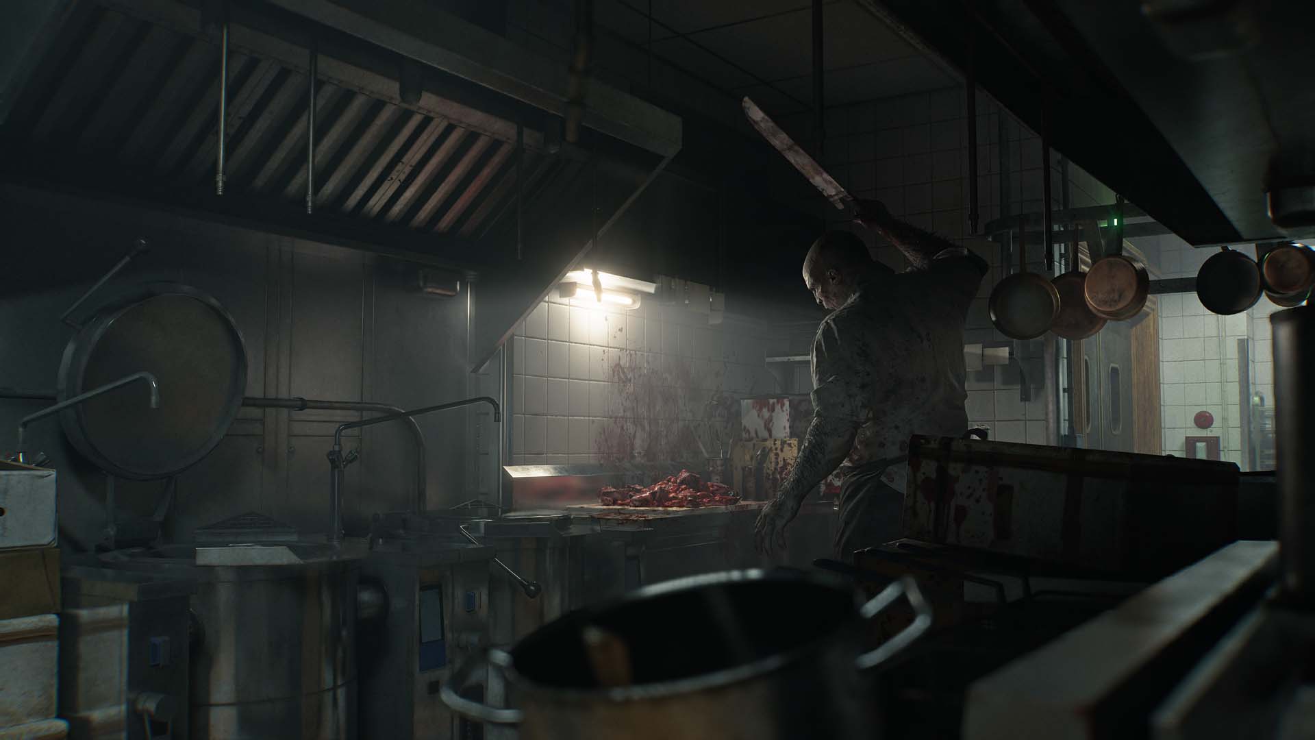 さらに、キッチンとその周辺の廊下を徘徊し、肉を探し求める巨大なシェフのような怪物も登場します。弾丸はせいぜい彼を苛立たせる程度の効果しかなく、その結果グレースができることは、彼に近づかないようにすることだけでした。過去作における「タイラント」や「ネメシス」のように、ゲーム全体を通して執拗に追い回してくる存在とは異なり、『バイオハザード レクイエム』ではより局地的に配置された恐怖がいくつも用意されているようでした。筆者が最初にシェフと遭遇したのは彼の持ち場であるキッチンで、そこでは忍び足を駆使することでやり過ごす必要がありました。その後、ショートカットを開通させると、彼の徘徊範囲は多少広がったものの、出現場所から大きく離れたエリアでその姿を見ることはありませんでした。