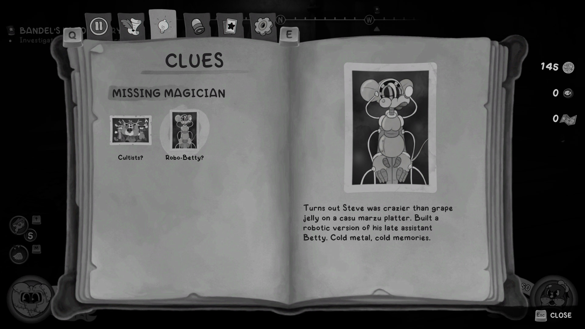 試遊版の締めくくりとして、私はペッパーの事務所へ向かって、彼の捜査ボードを確認しました。ボードには「行方不明の魔術師」という言葉が走り書きされ、名探偵の定番のごとく、何枚もの写真が糸で繋がっていました。そこに、今回のプレイで得た 3 枚の新しい写真「カルト教団員」、「ロボベティ」、そして「到着カード」を付け加えます。これらはすべて秘密研究所のミッションをクリアして入手したものです。