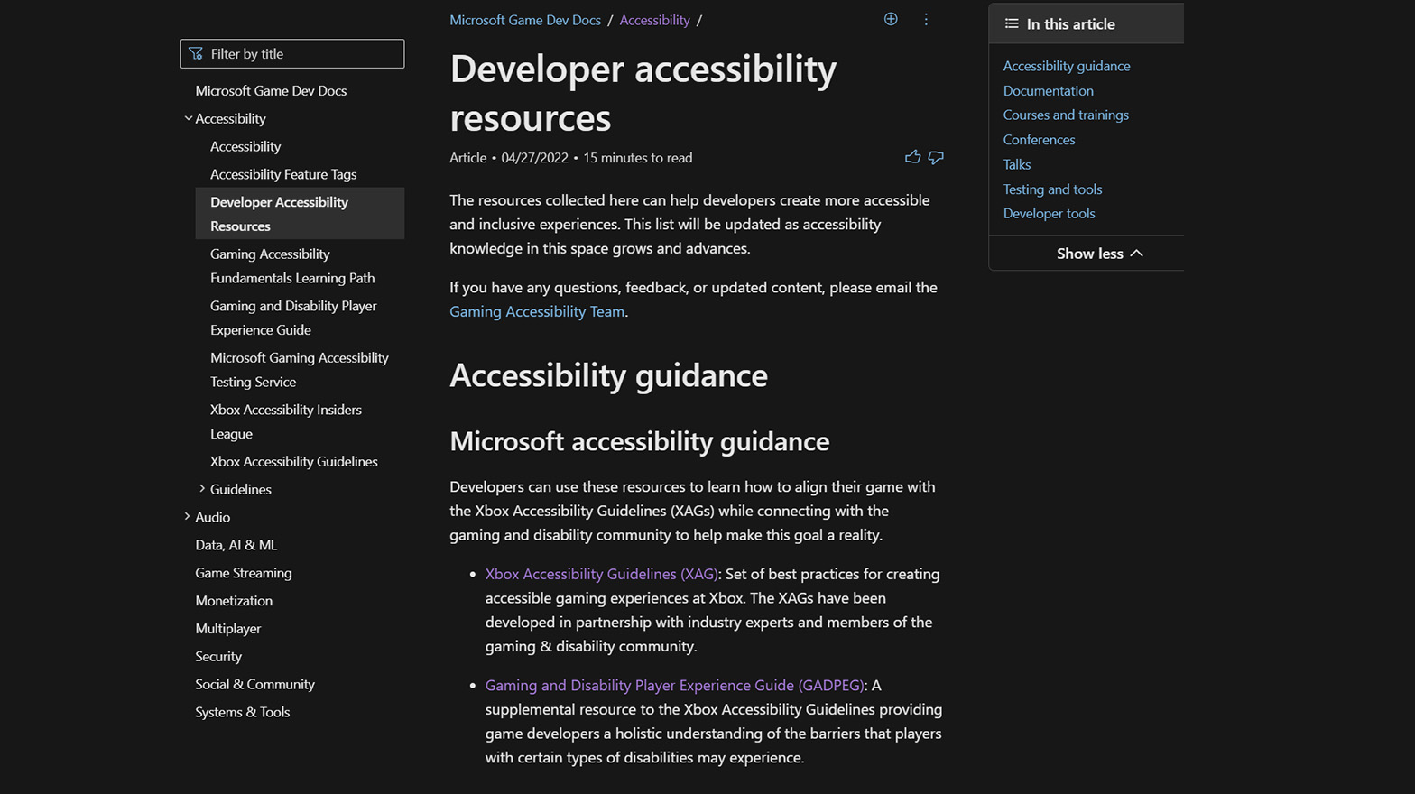 As Diretrizes de Acessibilidade do Xbox (XAGs) lançadas em 2019 como um recurso gratuito para criadores de jogos servindo como um conjunto de práticas recomendadas para validar a acessibilidade do jogo. Xbox continua a implementar novas diretrizes com base no feedback da comunidade. Este mês, eles anunciaram a adição de práticas recomendadas sobre saúde mental, enjoo e clareza no dimensionamento de texto.