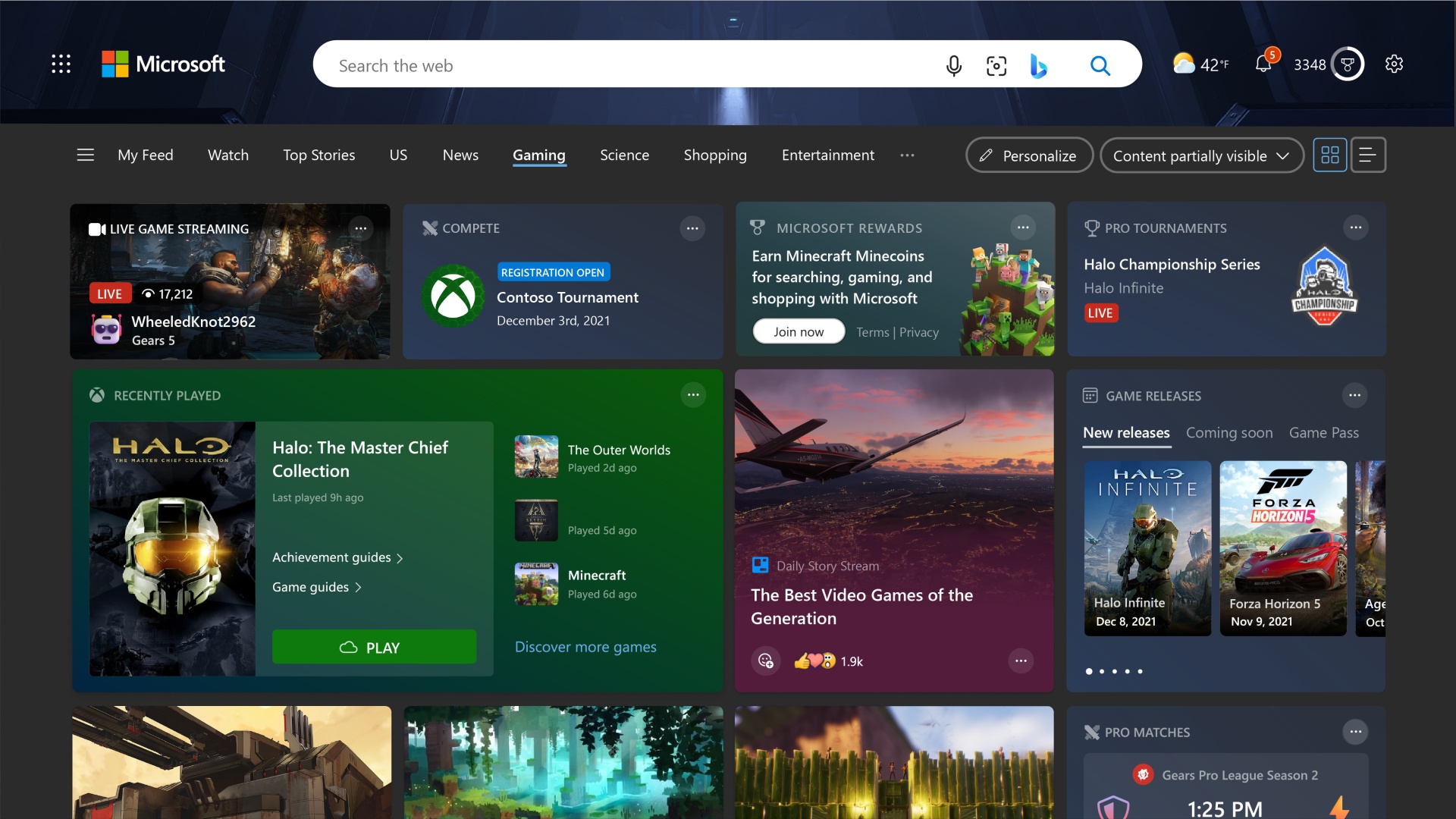 Neste último verão nós lançamos várias melhorias para o Microsoft Edge para torná-lo o “melhor navegador para gamers”. A nova página inicial de games te joga direto na ação e permite que ganhe pontos do Microsoft Rewards assim que você inicia o navegador, com histórias personalizadas e fácil acesso à biblioteca do Xbox Cloud Gaming (Beta), incluindo jogos que você recém jogou (é necessário uma conta Xbox).