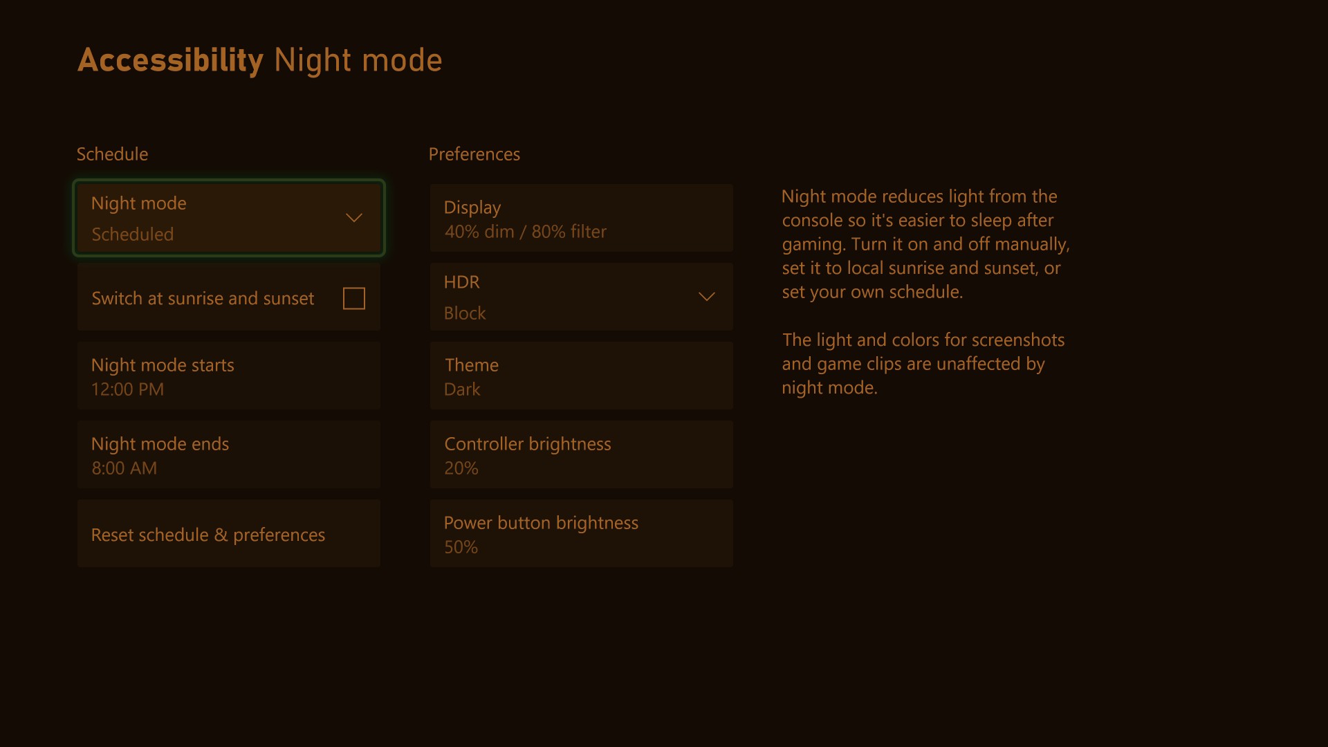 Настройки работают на всей системе Xbox, включая приложения и игры, и не влияют на производительность, снимки экрана и игровые клипы. Вы можете настроить автоматическое включение или выключение этой функции на рассвете и закате, а также выбрать временной промежуток, соответствующий вашим потребностям. Кроме того, вы можете поставить динамическое переключение между дневной и ночной темой на консоли и следовать расписанию ночного режима.